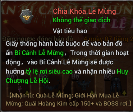 Nội dung: Sử dụng chìa khóa đặc biệt để vào Bí Cảnh Lễ Mừng.